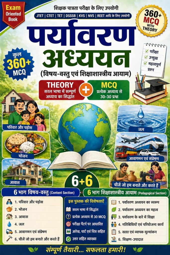 अगर आप CTET, JTET, TET या अन्य शिक्षक भर्ती परीक्षाओं की तैयारी कर रहे हैं, तो यह EVS (Environmental Studies) Book आपके लिए एक complete solution है। इस book में आपको Theory + MCQ दोनों एक साथ मिलते हैं, जिससे आपकी तैयारी और भी आसान और effective हो जाती है।